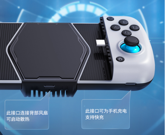 背部制冷模块可滑动就像空调设计原理一样,有了制冷,也有散热。X3背部有一个7叶组合风扇,能够快速散热。玩家如果想要开启散热功能,需要保持插上手柄中间的Type-C线。