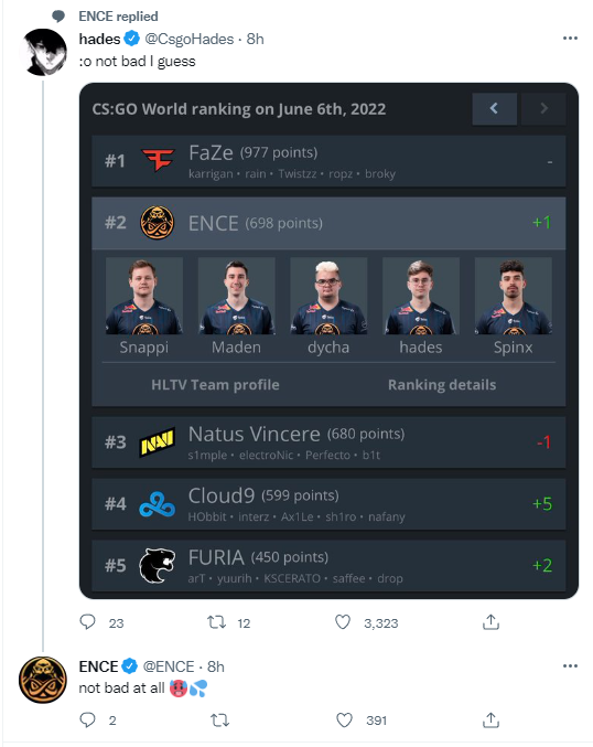 ENCE在过去四周取得了巨大成功,不仅在Major进入四强,还在IEM达拉斯获得亚军,这样的好成绩足以让他们超越NaVi,成为第二。他们也达到了2019年7月以来的最佳排名,而上次他们只在第二暂待了一周。