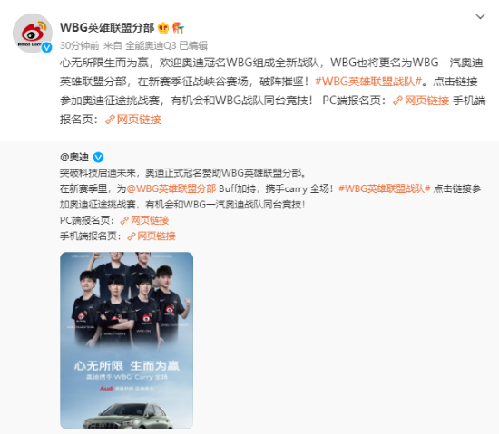 奥迪于今晨宣布,正式冠名赞助WBG英雄联盟分部,随后《英雄联盟》WBG英雄联盟分部宣布,将正式更名为WBG一汽奥迪英雄联盟分部。
