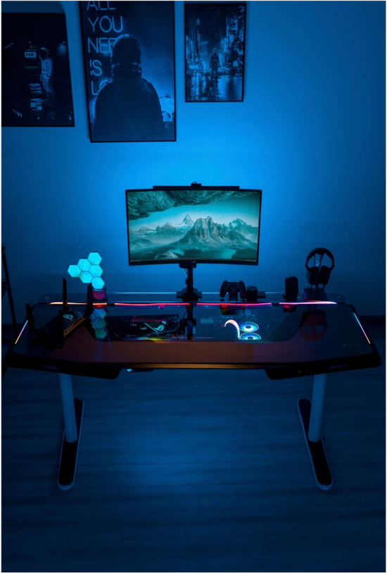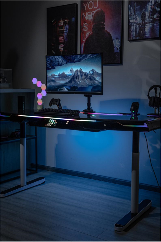桌子内嵌1米梯形空间,可DIY台式机配件,节省了桌上空间,颜值也很炫酷。桌体自带RGB光效,支持神光同步,打造沉浸式游戏氛围,深受纯血电竞玩家追捧。其中桌后特制的滑轨模块也备受关注,松能Humanmotion自主研发的滑轨模块,实现多屏、大屏多场景摆放,突破显示器支架的横向使用范围,满足玩家对于屏幕的不同位置需求。可见,玩家对于电竞装备的需求不仅是炫酷外观这么简单,更多的是游戏体验。