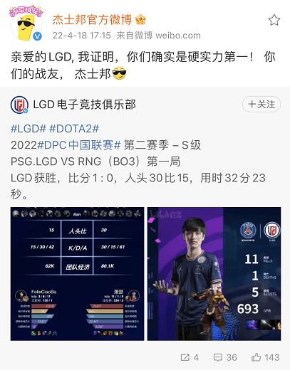 杰士邦的初次尝试也不止于此,借LGD在DPC中国联赛的夺冠热度,品牌与LGD官博长期互动,持续供热话题#杰士邦电竞联盟#,告知所有电竞爱好者杰士邦正式加入电竞游戏圈。
