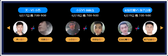 每位人气主播分别带上自己的2位水友运用2个联动角色影与光进行3v3对抗赛,同步演绎这对CP的高光时刻。每场直播的对抗赛赛制均为BO5。