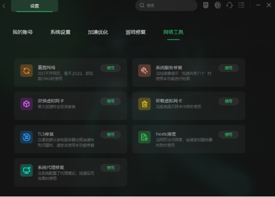 奇游加速器右上角的设置里,更是有着hosts清理、重置网络等各种网络问题修复工具。