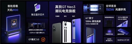 随着移动电竞的蓬勃发展,移动电竞行业软硬结合的需求日益增长,不仅极大地推动了整个手游内容的精品化进程,同时也驱动着手机厂商对电竞体验的深度优化。真我GT Neo3作为真我手机入局电竞赛道的首款作品,采用 “赛道双条纹设计”,将经典跑车纹勒芒条纹化身为性能和速度的图腾,还原竞速赛道美学;全球首发150W光速秒充,以“5分钟充电50%”的超快速度惊艳出位。