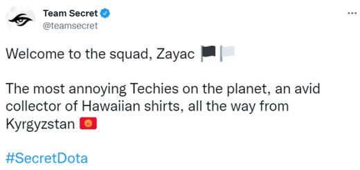 在6月11日开始,Secret战队便让Zayac代替身体不适的YapzOr出战。然而在替补次数用完以后,YapzOr还未康复。因此Secret战队不得不作出决定让Zayac代替YapzOr担任队内的四号位,这也可以让YapzOr安心养病。希望Secret战队之后的比赛能够一切顺利,也希望YapzOr能够早日康复。