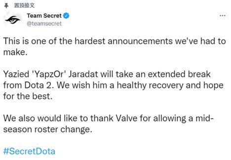 在今日凌晨,Secret战队在推特上发布了一则消息,YapzOr因身体不适而暂离Dota2职业赛场。以下为推特原文: