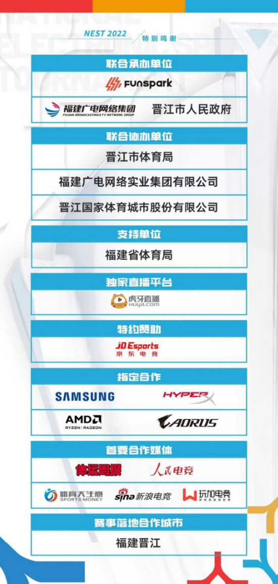 新朋旧友欢聚一堂,2022NEST特约赞助京东电竞,为呈现精彩电竞赛事不懈前行。2022NEST唯一指定显示器合作伙伴三星玄龙骑士,助力高清竞技画质;2022NEST唯一指定外设合作伙伴极度未知HyperX,畅享极致游玩体验;2022NEST唯一指定硬件平台AMD,领略硬核科技魅力;2022NEST唯一指定电竞主机合作伙伴技嘉AORUS,护航选手流畅操作。2022NEST与合作伙伴们共创赛事高光,打造电竞盛宴。
