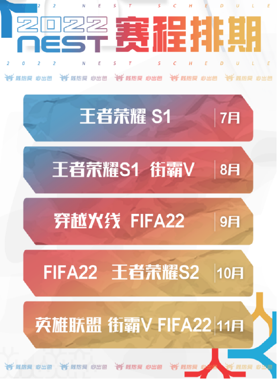 今年NEST全国电子竞技大赛将设立《王者荣耀》、《街头霸王V》、《穿越火线》、《FIFA22》和《英雄联盟》五项备受推崇的电竞项目,全年赛程横跨七月至十一月,将为所有电竞爱好者和NEST赛事粉丝带来更精彩更出色的电竞盛宴。