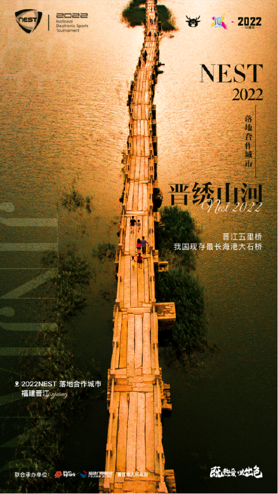 在数字中国的大背景下,数字福建建设正在高质高效地开展中,晋江作为文旅体育名城,担当数字中国建设的头部力量。而NEST全国电子竞技大赛,是中国国家级综合类自主赛事,更是数字体育发展的行业标杆。2022NEST来到晋江,不仅是数字福建建设、晋江文旅体育相互赋能的重要节点,也是NEST全国电子竞技大赛新的征程,2022NEST在晋江拥抱新未来,邀请粉丝们一同见证中国电竞的繁花似锦,既热爱,必出色,我们相约晋江,谱写电竞新华章!