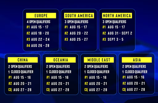 北美赛区也将采用相同的形式,三个公开预选赛中各有两支队伍将在美洲RMR中获得一席之地。与此同时,南美赛区将被授予总共七个席位:前两场公开预选赛各提供两个名额,第三场也是最后一场将有三支队伍出线。最终从预选赛中杀出的队伍将在RMR中与Liquid、FURIA和Imperial一同展开竞争。