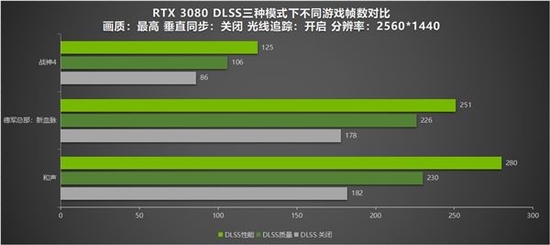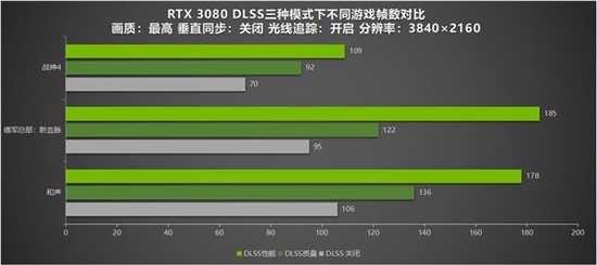 本次测试的游戏为《和声》、《德军总部:新血脉》和《战神4》。(注:《战神4》并没有光线追踪技术,其余游戏皆在光线追踪开启模式下测试)在2K分辨率光线追踪开启最高画质的设置下,RTX 3080 表现优异,即使是在DLSS技术关闭的前提下最低也能跑到80 FPS以上,当开启DLSS后,质量模式下帧数能提升26%,性能模式下更是能提升54%。在《和声》中更是能趋近于300 FPS,已经远远超过能完美流畅游戏的标准了。