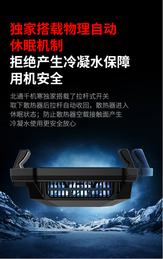 北通千机寒手机散热器巧妙在固定挂钩处设计了自动断电机制,取下立即进入休眠状态,保证玩家的设备任何时候都干干爽爽。