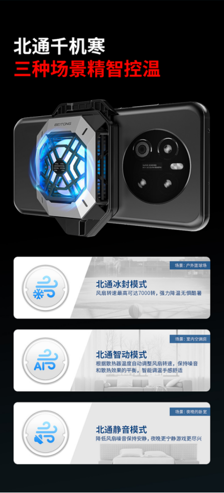 针对手游玩家持续游玩手机需要散热的问题,作为国内智能游戏外设头部厂商的北通,在7月28日发布了新品北通千机寒手机散热器,支持三种场景精智控温,一次解决散热、舒适和安静三个玩家痛点。