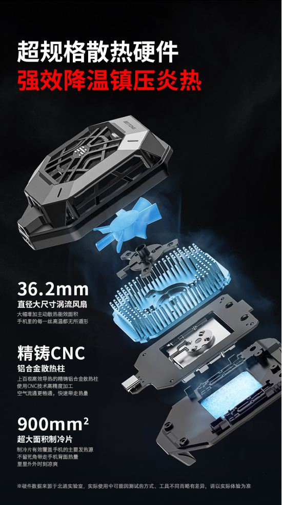 36.2mm大尺寸涡流风扇+精铸CNC铝合金散热柱+900mm2超大面积制冷片,超规格散热硬件,高效散热的有力保障。