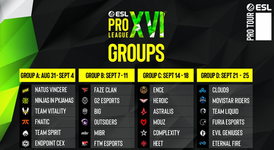 C组则由两支最强的丹麦队伍——Astralis和Heroic领衔,与他们同组还包括了EPL S15亚军ENCE,赛程日期为9月14日至18日。最后D组的赛事将会在9月21日至25日举行,其中Cloud9和Liquid是该小组的晋级热门。