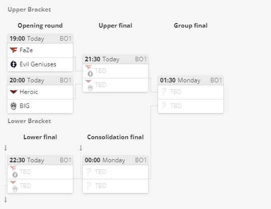今晚C组的比赛就要开打,本组最值得期待的队伍当属现世界第一战队FaZe,刚刚经历“双喜临门”的FaZe能否继续自己的连胜,另一边Heroic和BIG虎视眈眈准备大干一场。BO1的乱战一切皆有可能,就让我们拭目以待。