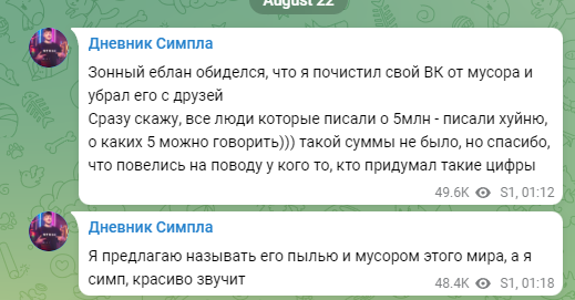这货太过于冒犯了,我会把他像一样垃圾从我的VK中清掉,将他从我的朋友列表中立刻删除。所有说打赏了500万的,写的都是**,根本就不存在这样的数额,但是感谢你人云亦云地提出这么个说法。