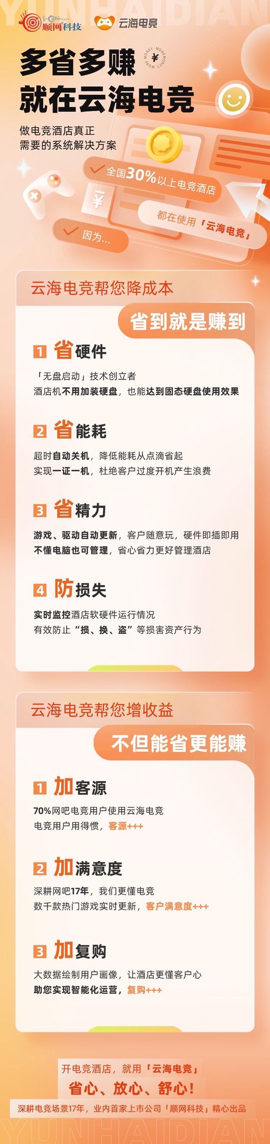 顺网科技方面,日前在电竞酒店赛道的推进也十分迅猛。战略方面,顺网科技希望通过电竞酒店布局,保证公司的基础业务平稳性,打开增长空间;生态方面,顺网科技有意在IP、PMS、OTA多方领域展开生态合作,此前,顺网科技参与投资电竞酒店IP项目的竞鹅电竞酒店已在杭州开业;产品服务方面,顺网科技推出“云海电竞”电竞酒店系统解决方案,目前已30%以上市占率;功能方面,云海电竞将实现“无盘启动”、“自动关机”、“自动更新”、“监控防盗”以及“用户画像”等功能,助力电竞酒店业主降本增收。