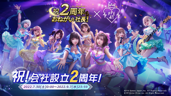 益世界《商道高手》日本版《拜托了社长》(《おねがい社長!》)迎来 2周年庆!值此2周年之际,《拜托了社长》也同步开启与偶像团体PPE41的联动。在本次2周年联动,《拜托了社长》不仅打造了主题曲「ぷりーずぷれじてんと!」,用“我会在你身边”等歌词表达对玩家的感谢,也同步推出了红卡人才与秘书皮肤等定制福利,在游戏中继续陪伴玩家征战商场。