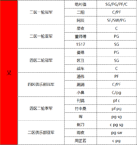 吴国队长绝对值首选星夜,董师傅,可以看出小强想要赢下阵营战的决心,队中有国服最顶尖的几位选手阿辰,二阳,潘伟保证了阵营的硬实力,搭配小鼻和漏漏的顶级双PF阵容以及四区顶尖SG区丑,成熟稳重的日军哥等。整体分析,阵营中双外阵容居多,综合实力是三个阵营中最强的。