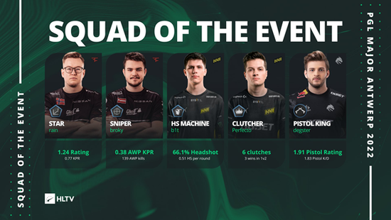 PGL 安特卫普 Major随着FaZe的夺冠落下帷幕,HLTV评选出本届赛事的最佳阵容。