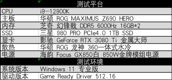 本次测试平台处理器采用英特尔酷睿i9-12900K搭配ROGMAXIMUS Z690 HERO主板,CPU在游戏时间睿频至5.0GHz左右;内存采用芝奇幻锋戟 DDR56000Hz 16GB*2;固态采用的是PCIe4.0固态,性能比PCIe3.0的固态读写速度更快;散热是华硕 ROG 龙神 360一体式水冷,强大的散热性能能够让CPU发挥出稳定的性能;最后电源是海韵 Focus GX850白 850W金牌模组电源,这套配置可以让影驰GeForce RTX 3080 Ti 金属大师显卡稳定发挥出其应有的超强性能!