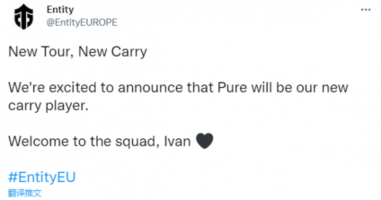 Pure 已成为 Entity 战队新成员。战队官方在 Twitter 上宣布了该消息。