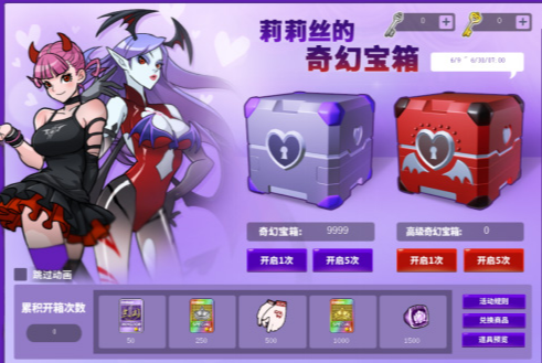 莉莉丝的奇幻宝箱活动将以账号为单位进行。玩家可以通过“奇幻宝箱钥匙”打开奇幻宝箱获得各种道具。打开奇幻宝箱有概率获得“高级奇幻宝箱”,可以使用“高级奇幻宝箱钥匙”打开。抽取分为1次/5次抽取。
