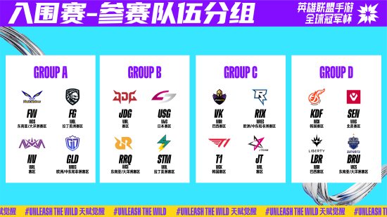 作为《英雄联盟手游》首个官方正式全球性赛事,全球冠军杯汇集了来自全球各地8大赛区的24支顶尖手游队伍。其中包含中国大陆赛区的FPX、JDG、NV和JT,东南亚/大亚洲赛区的TF、FW、RRQ和BRU,拉丁美洲赛区的LEV、FG和STM,巴西赛区的OMH、VK和LBR,欧洲/中东和非洲赛区的TQ、RIX和GLD,韩国赛区的RY、KDF和T1,日本赛区的SG和USG,以及北美赛区的IMT和SEN。