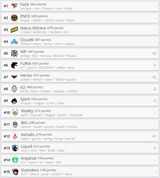 FaZe、ENCE、NaVi仍然稳坐前三名的位置,紧随其后的是IEM达拉斯2022的冠军得主Cloud9。瑞典战队NIP则依靠着GET迪拜2022的冠军积分成功将FURIA拉下,一举挤进TOP 5。Heroic在Pinnacle Cup的捧杯也让他们上涨两名来到第7位。