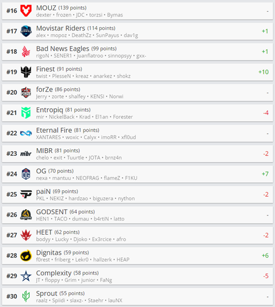 TOP 30中,另一支瑞典战队Finest在Pinnacle Cup上的优秀表现让他们暴涨10名打入TOP 20的行列之中。另一边GET迪拜2022的四强选手OG目前也处于稳定上升的态势。