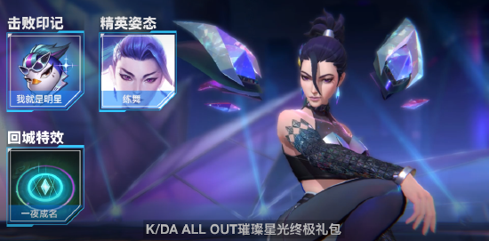 K/DA ALL OUT 璀璨星光终极礼包(内含K/DA ALL OUT 萨勒芬妮、K/DA ALL OUT 卡莎、K/DA ALL OUT 伊芙琳,K/DA ALL OUT 阿狸、K/DA ALL OUT 阿卡丽 五款皮肤,卡莎精英姿态一款,【我就是明星】击败印记一款,【一夜成名】回城特效一款)