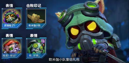 欧米伽小队集结礼包(内含欧米伽小队 鬼影蛙人 菲兹、欧米伽小队 幽灵特工 提莫、欧米伽小队 魔鬼伞兵 崔丝塔娜三款皮肤,【抓到你了】、【瞄准!锁定!】、【呃...好晕】三款表情、【欧米伽小队】击败印记一款)