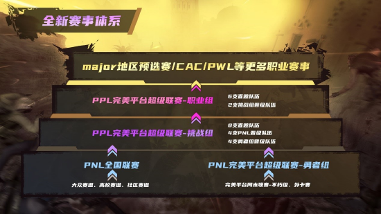 每届PPL分为勇者组、挑战组、职业组三个阶段。玩家可自组战队,通过参与完美平台周末联赛或勇者组外卡赛,获得进入勇者组的资格。从勇者组脱颖而出的4支队伍将与8支直邀职业队以及4支PNL(完美世界CS:GO全国联赛)晋级队伍共同组成挑战组。