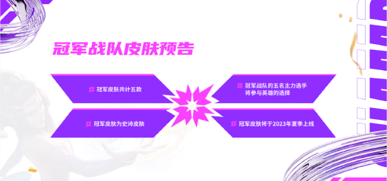 官方还将推出手游专属冠军战队皮肤,以纪念冠军战队的光荣胜利。本次夺冠的NV战队里的五位主力选手将参与英雄的选择,并预计在来年夏季推出五款史诗级的冠军皮肤。