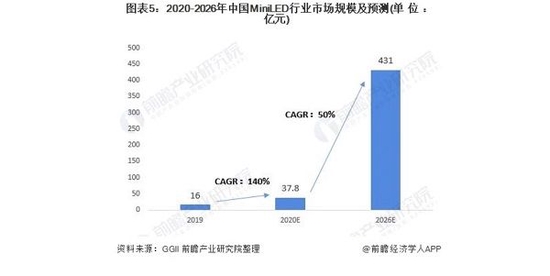 根据GGII数据显示,2019年中国MiniLED市场规模在16亿元左右,预计20年MiniLED市场规模达到37.8亿元,同比增长140%。前瞻预测,2026年中国MiniLED行业市场规模有望突破400亿元。