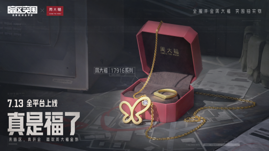 《暗区突围》联动周大福启动开真金活动。活动期间,先锋们在对局中成功搜索并带出金饰品道具,进行开金鉴定后即可换取大量柯恩币,鉴定后最高增值可达90倍。当全服搜索金饰品达到一定次数时,将解锁官网活动页的全服玩家22K金饰品抽奖活动,参与H5抽奖即有可能获得周大福17916系列定制22K金饰品。