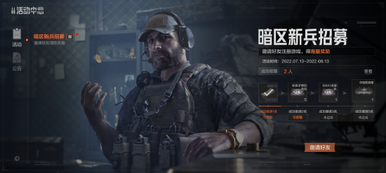 7月13日7:00到8月5日24:00期间,在《暗区突围》官网集结活动点击邀请,分享邀请码、二维码或邀请链接给好友,成功邀请好友下载游戏并注册,累计数量达标时即可获得礼包奖励。