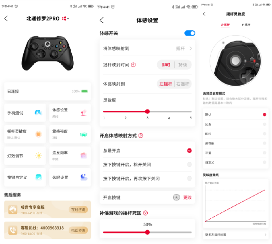 和传统在电脑端的插线调节相比,这次北通阿修罗2 Pro多模版加入的手机App调设功能省去了一大堆匹配、连接电脑的步骤,只需要蓝牙连接手柄和手机,就能快速地对手柄的全部功能进行调整。无论是简单单的RGB、按键震动强度、连发频率,甚至是更高阶的体感灵敏度、摇杆灵敏度和摇杆死区功能,通通都只需要点点手机就能完成配置。