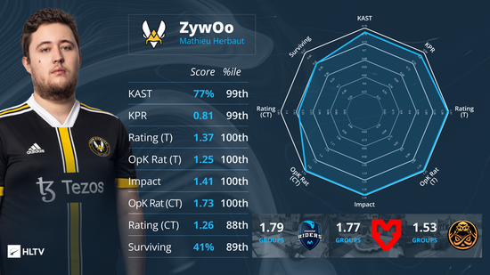 和在里斯本时一样,ZywOo在科隆再次保持了火热的手感,但是和里斯本不一样的是,这种现象级的个人发挥却未能帮助队伍进入淘汰赛。这位去年的TOP2选手为队伍倾其所有,打出了77.7%的KAST(第一),1.41的IMPACT(第一),0.81的每回合击杀(第二)以及1.31的Rating(第一),这还是在Vitality在科隆胜率不足五成的情况下取得的,全队的糟糕表现也是拖累ZywOo不能在这份榜单上更近一步的直接原因,很显然这支法丹战队还有许多工作要去完成。