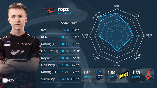 抛开决赛的平庸发挥不说,ropz在和Movistar Riders的半决赛较量中交出满意答卷,1.51的系列赛Rating为全队最佳,另外他的47%的生存指数也要比不少打法保守的狙击手高出不少。但无论如何,ropz在本次的发挥,比起其他三位队友,还是略显逊色。