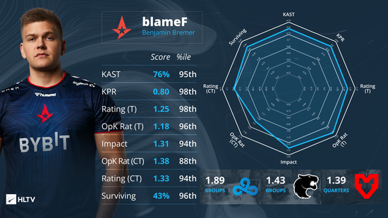 固然数据出众,但是blameF在某些地方依旧值得诟病,和去年下半年Niko的英勇无畏打法不同,blameF似乎太在乎自己在这方面的数据了——每回合死亡率为0.57次,仅次于以保守著称的sh1ro,而他在Astralis输掉的回合中有18%的几率活到最后,这个数据也仅仅比Jame这位以保枪闻名的的选手低两个百分点。很显然,blameF还有很多进步的空间。