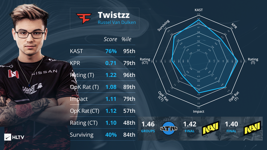 虽说前两张地图手感不佳,Twistzz在决赛上的综合表现依然称得上出色,Twistzz在后三图的比赛中分别交出了1.32,1.42和1.40的骄人数据。综合整个比赛来看,Twistzz在进攻端的表现(进攻端Rating 1.22)在所有选手中排名第四,在淘汰赛阶段能打出1.17的Rating并列第三,为FaZe拉开进攻空间做出了不可磨灭的贡献。甚至他至少一换一的比率也能达到27.3%,这项数据在所有选手中排名第一。