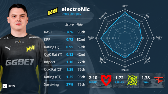 转型指挥的电子哥并没有因为位置的变化而舍弃数据,我们也很难观察到他因为这个新的职责而分心自己的个人发挥。事实上,遇强则强的他在淘汰赛阶段的发挥(1.17)甚至比小组赛(1.15)更胜一筹,而且他在淘汰赛所有比赛的Rating均在1.0以上。和Twistzz一样,electroNic在决赛中也打出了炸裂的数据,他在最后两张图上分别贡献1.38和1.37的Rating,是NaVi阵中的定海神针。