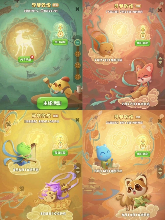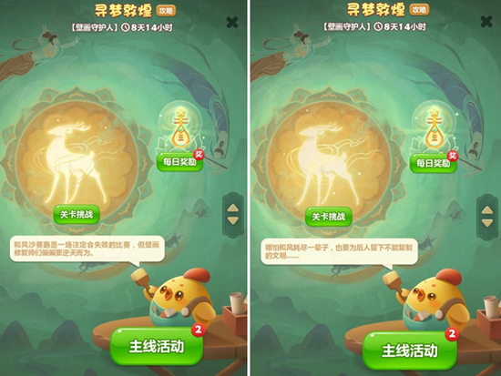 除了主线活动,消消乐也结合了敦煌文化中“画、舞、乐、史”的特点,设置了灵鹿复苏、舞乐飞天、天音绕梁、丝绸之路4个主题活动关卡,在消除玩法的基础上,融入不同的敦煌元素进行创新设计。