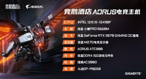 技嘉科技携旗下高端电竞品牌AORUS有幸成为竞鹅酒店|腾讯电竞联名店指定设备提供方,参与了此次的深度合作。AORUS从诞生之初就是为了能为全球电竞玩家提供高性能的电竞主机,让玩家能肆意驰骋电竞战场。本次为竞鹅酒店配备全套AORUS技嘉全家桶产品更能让玩家掌握先机整机标配技嘉GeForce RTX 3070 GAMING OC魔鹰显卡,Intel i7 12700F CPU搭配技嘉B660系列电竞主板,机箱使用AORUS战鹰RGB炫彩灯光同步,在满足高端玩家追求电竞乐趣的需求同时,更能带你沉浸式体验电竞氛围。加上32寸AORUS电竞战术显示器助你洞察战局,掌握先机!