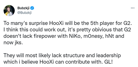 职业选手Bubzkji认为,如果HooXi加入G2他将会取得成功,因为目前队伍中并不缺乏火力点。他们缺乏的正是队伍结构和团队领导力,并且他表示很看好HooXi。