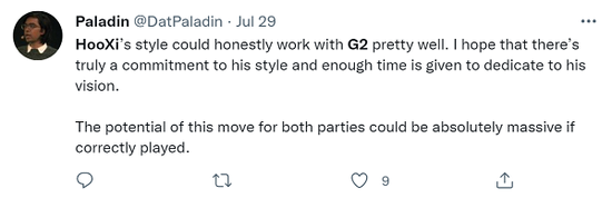另一位CS:GO分析师Paladin也表达了自己的祝愿,他认为HooXi的指挥风格会和G2契合,希望后者能够用时间证明,并在G2发挥出自己的潜力。