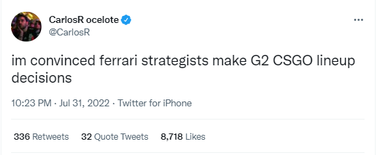 今日,G2老板卡老四发布了一则推特,将G2的问题与F1 法拉利车队的近期表现联系到一起。