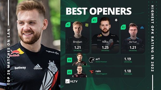HLTV发布数据显示,来自G2的突破手NiKo首杀rating为1.25,为上半年突破之最。领先NIP的Brollan(1.21)、C9的Ax1Le(1.21),成为了上半年最高rating的突破手。